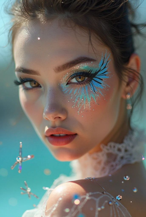 O glitter tradicional (microplásticos) polui oceanos – uma única aplicação pode liberar milhares de partículas.