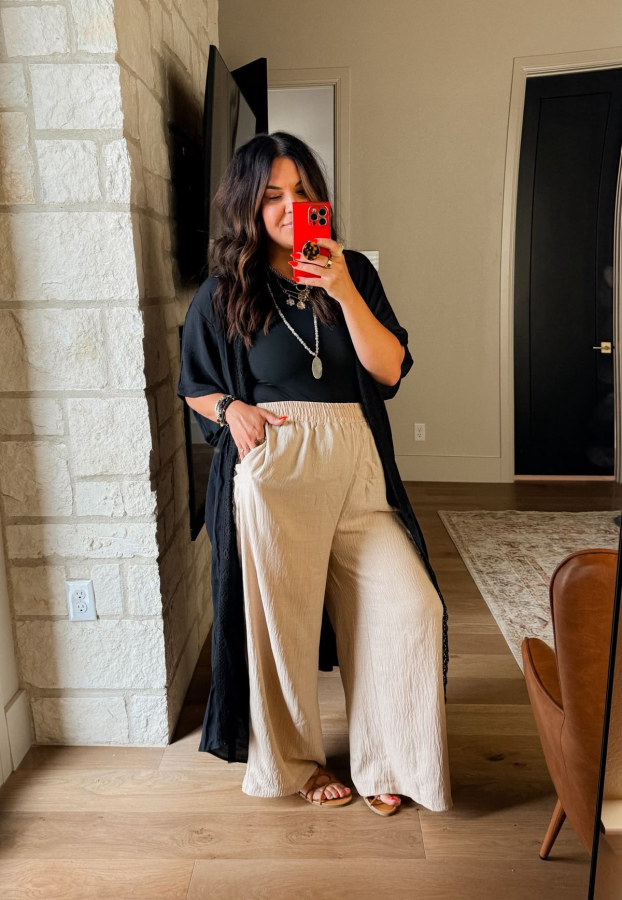 - Look 2: Blusa de seda + joggers + cardigã + chinelo slide = Conforto produtivo sem sair do “escritório-cama”.