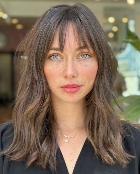 Wispy Bangs ou Curtain Bangs Descrição: Franja fina desfiada ou aberta ao meio. Indicado para: Todos rostos; integra com qualquer corte. Manutenção: Baixa. Celebridades: Tendência TikTok. Inspiração: Despojado effortless.