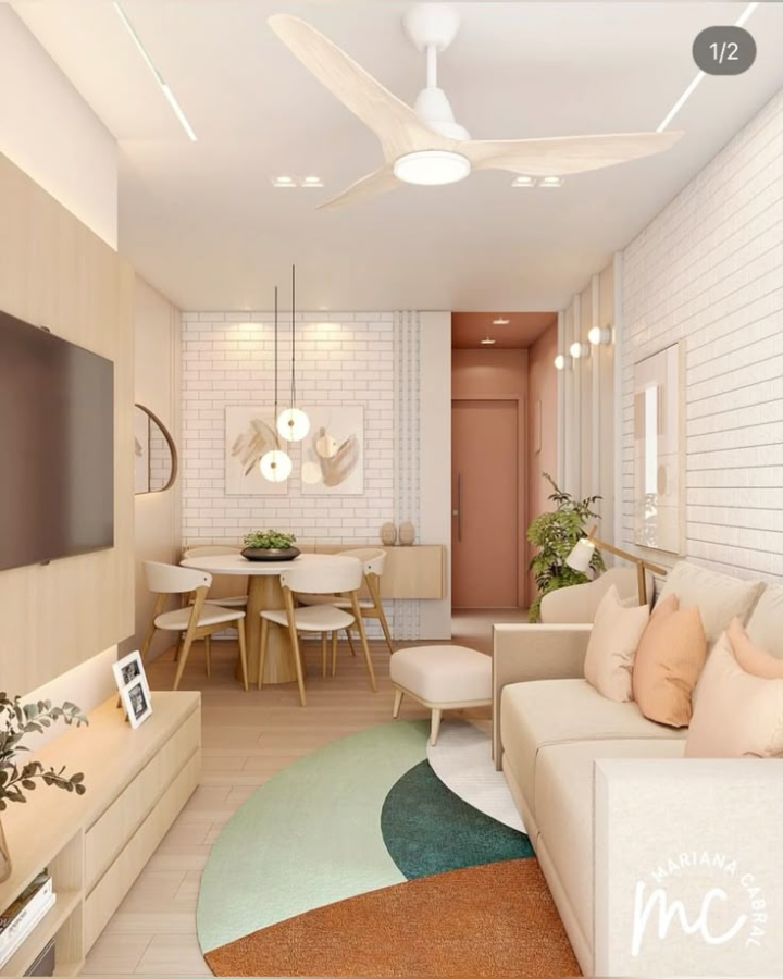 - Tapete que comece DEBAIXO das pernas dianteiras do sofá → une o ambiente sem ocupar mais espaço.
