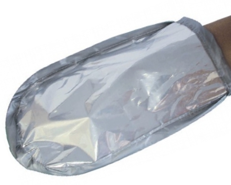Luva feita em material aluminizado com acabamento em viéz (não é elétrica). Lavável. Usada para hidratação das mãos.