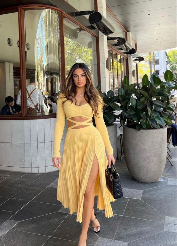 - Combinando com Neutros: Se preferir um toque mais discreto, use uma saia midi dourada com uma blusa branca ou um cropped amarelo com uma calça de linho off-white.