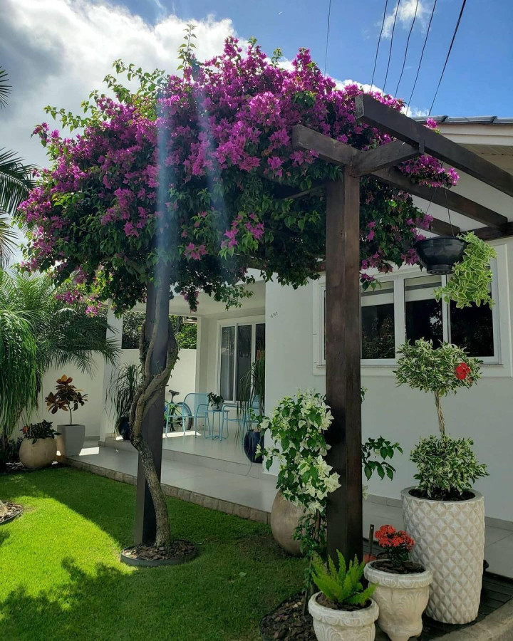 - Flores Trepadeiras: Jasmins, bougainvilleas ou rosas trepadeiras no pergolado criam um teto florido e perfumado.
