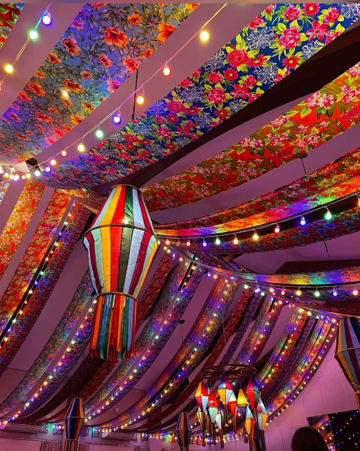Bem como, os balões decorativos de papel colorido dão um toque festivo e podem ser pendurados no teto, em varandas ou nos cantos do salão.